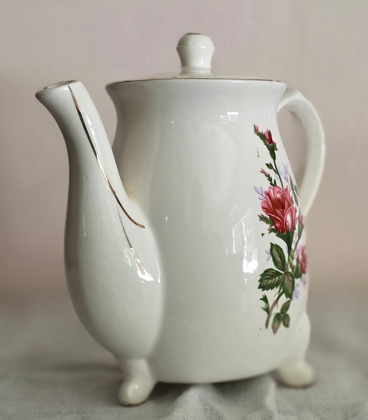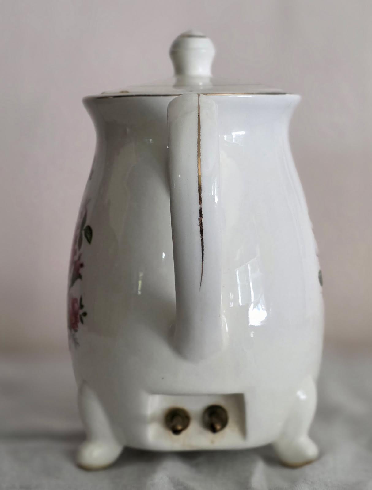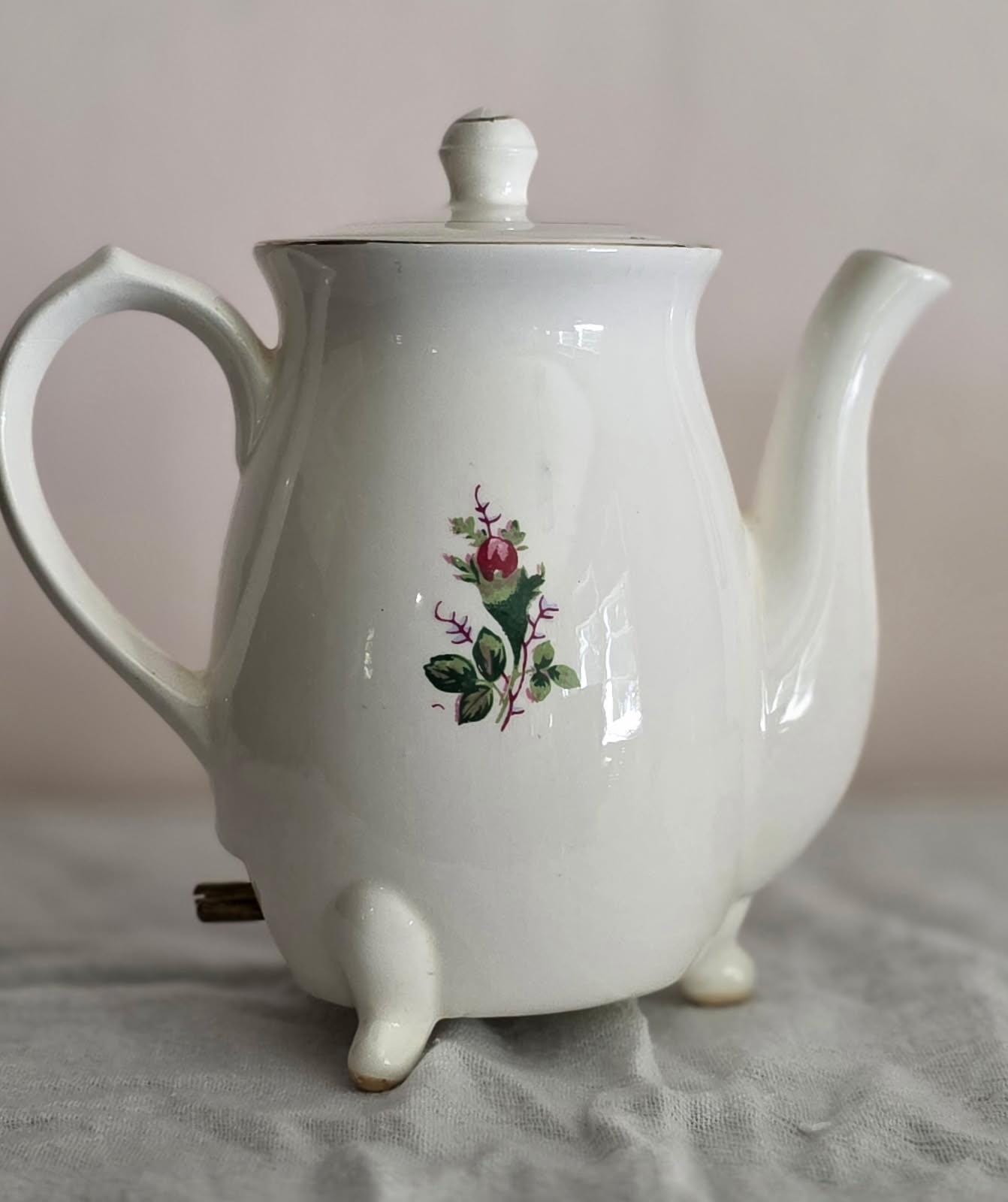 Working Mid-Century electric tea kettle with original cord. Vintage Moss Rose China pattern. Made in Japan by Minamiyama Seitosho circa 1950s. Please Note: This is a vintage electric appliance. While it has been thoroughly tested and is in good working order, it does not meet current UL/modern safety standards. It is recommended to be used for decoration purposes! There are a few small chips on the edges of the lid, but they do not affect display value as they cannot be seen on display.