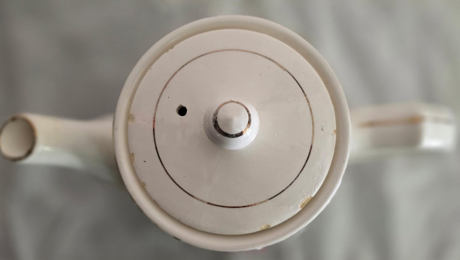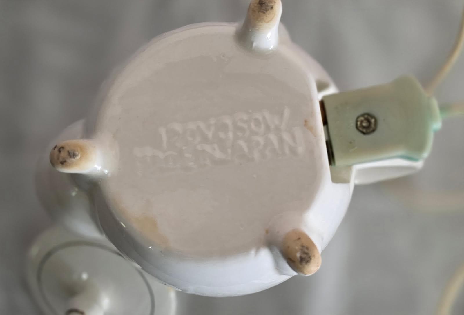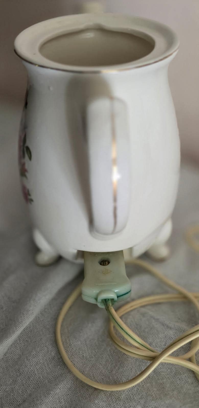 Working Mid-Century electric tea kettle with original cord. Vintage Moss Rose China pattern. Made in Japan by Minamiyama Seitosho circa 1950s. Please Note: This is a vintage electric appliance. While it has been thoroughly tested and is in good working order, it does not meet current UL/modern safety standards. It is recommended to be used for decoration purposes! There are a few small chips on the edges of the lid, but they do not affect display value as they cannot be seen on display.