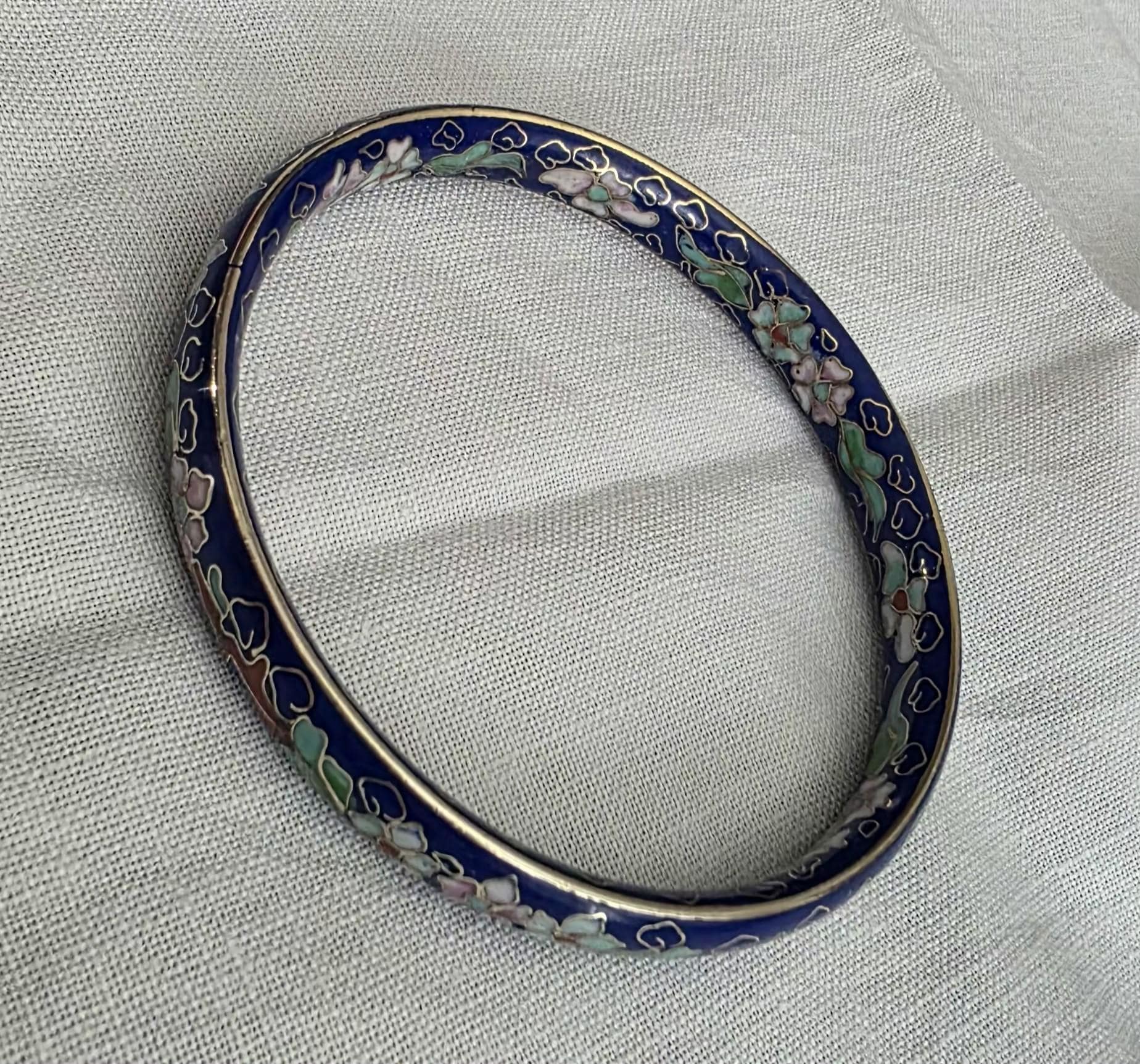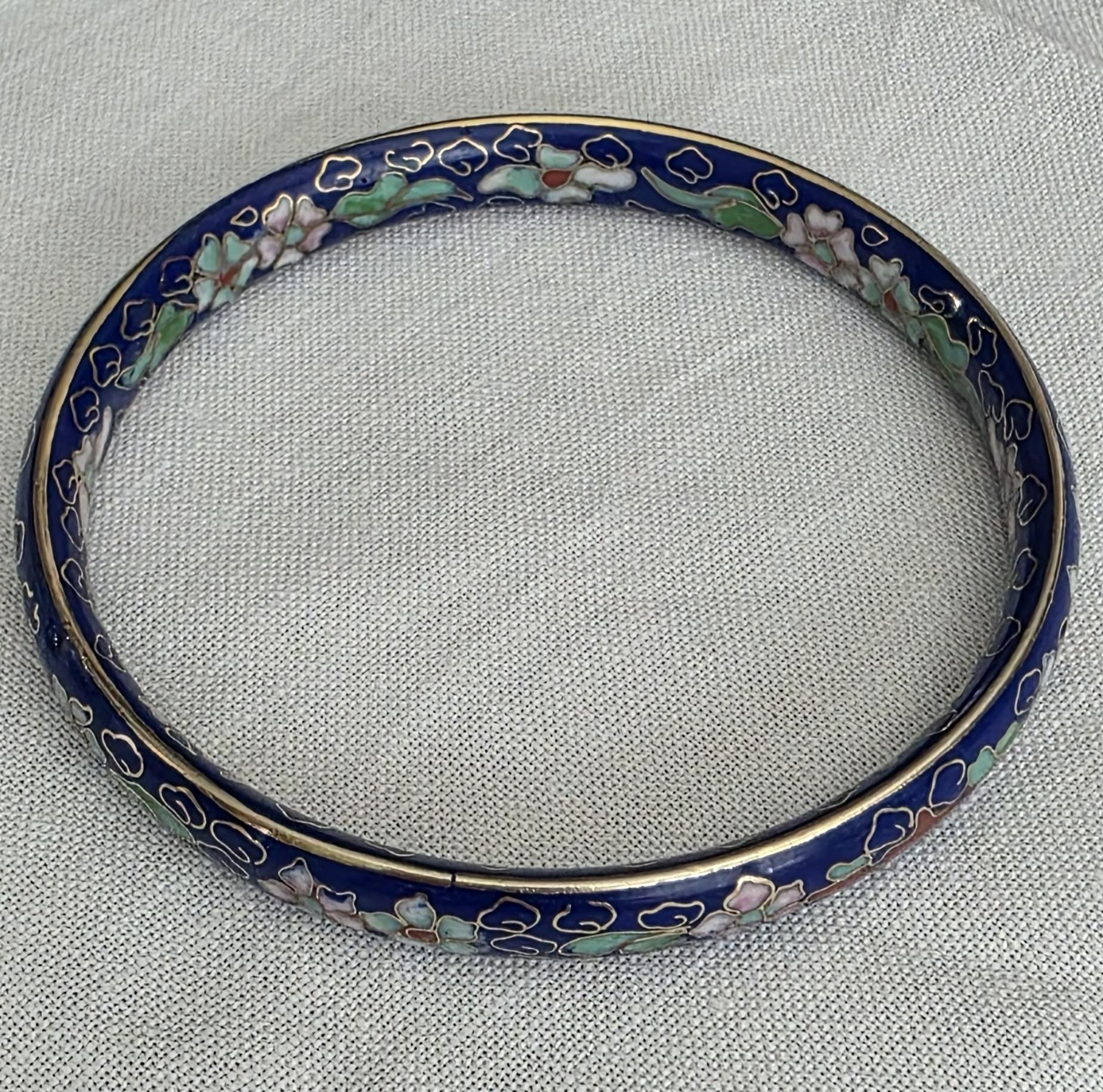 Elegant, hand painted vintage (1940s-1970s) 7.5" cloisonné bangle bracelet featuring cobalt blue enamel with hand-painted floral designs. Crafted on a solid brass base, this mid-century Chinese piece is both wearable art and a timeless collectible. Beautifully detailed, vibrant, and full of vintage charm! No chips or cracking in the enamel, this is truly a perfect condition vintage piece! .25" wide.