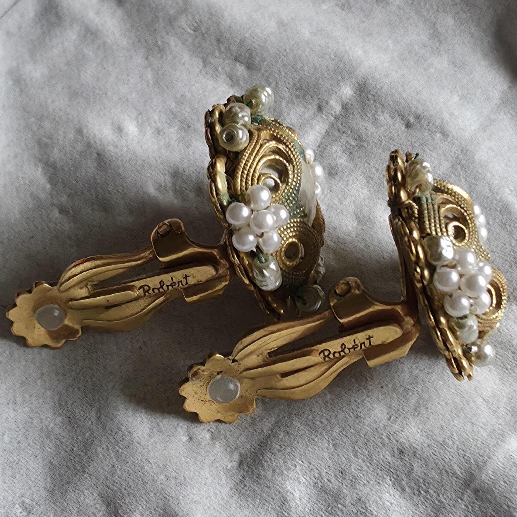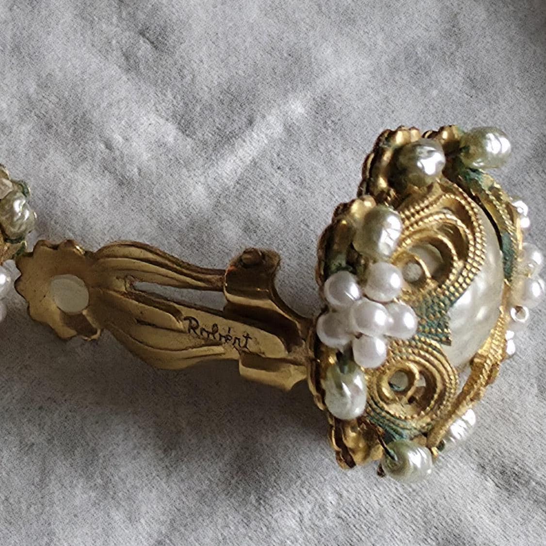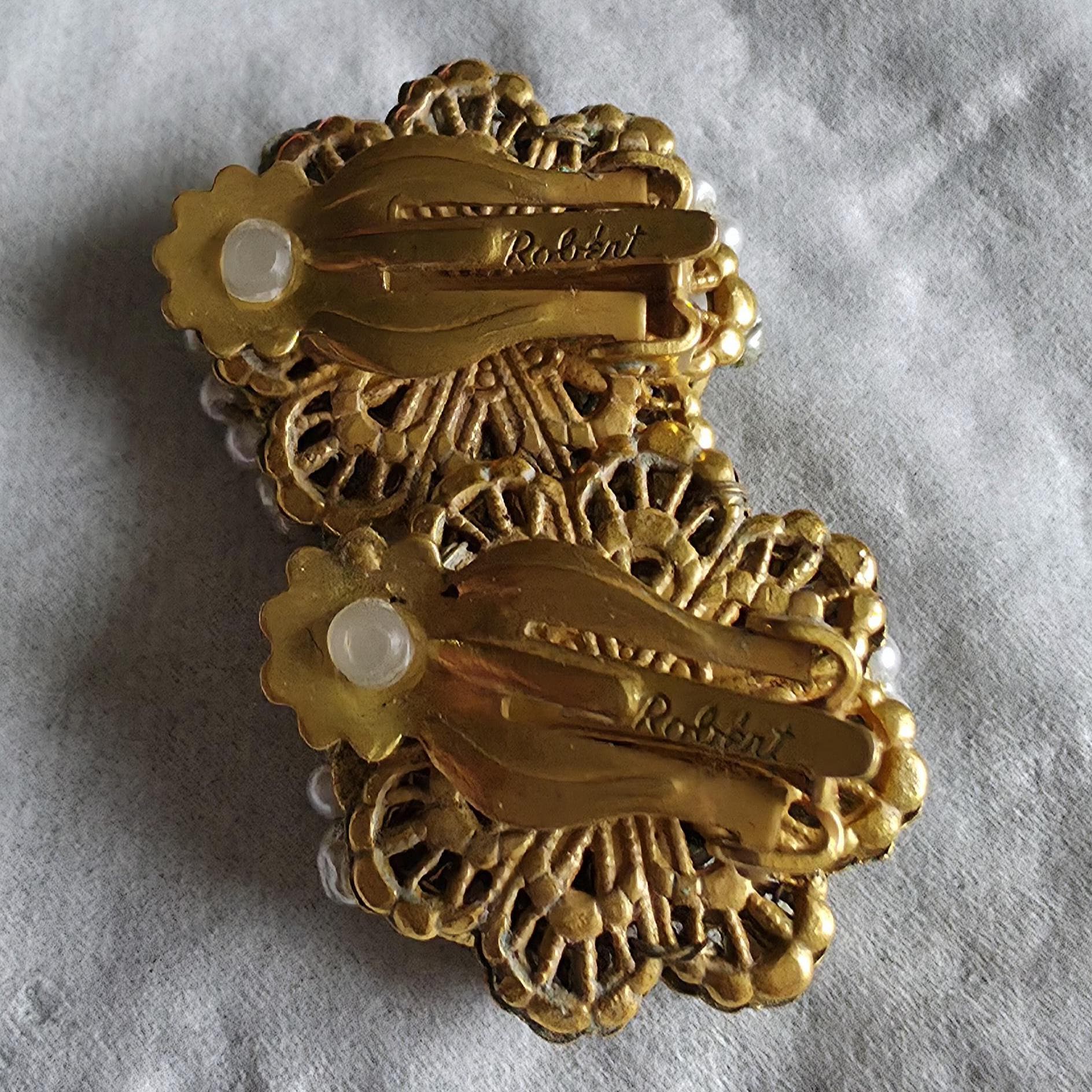 Exceptional vintage clip earrings signed Robert, circa 1950s. These ornate filigree settings feature hand-wired baroque pearls surrounded by clusters of lustrous seed pearls. Each pearl tests with a natural, gritty feel—strongly suggesting genuine nacre rather than imitation, an uncommon trait in Robert designs.