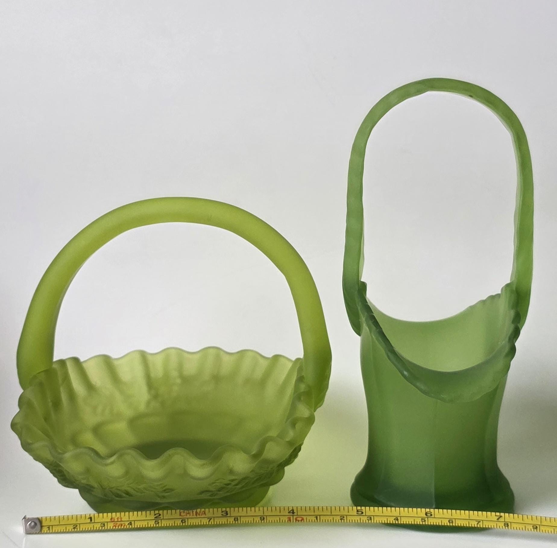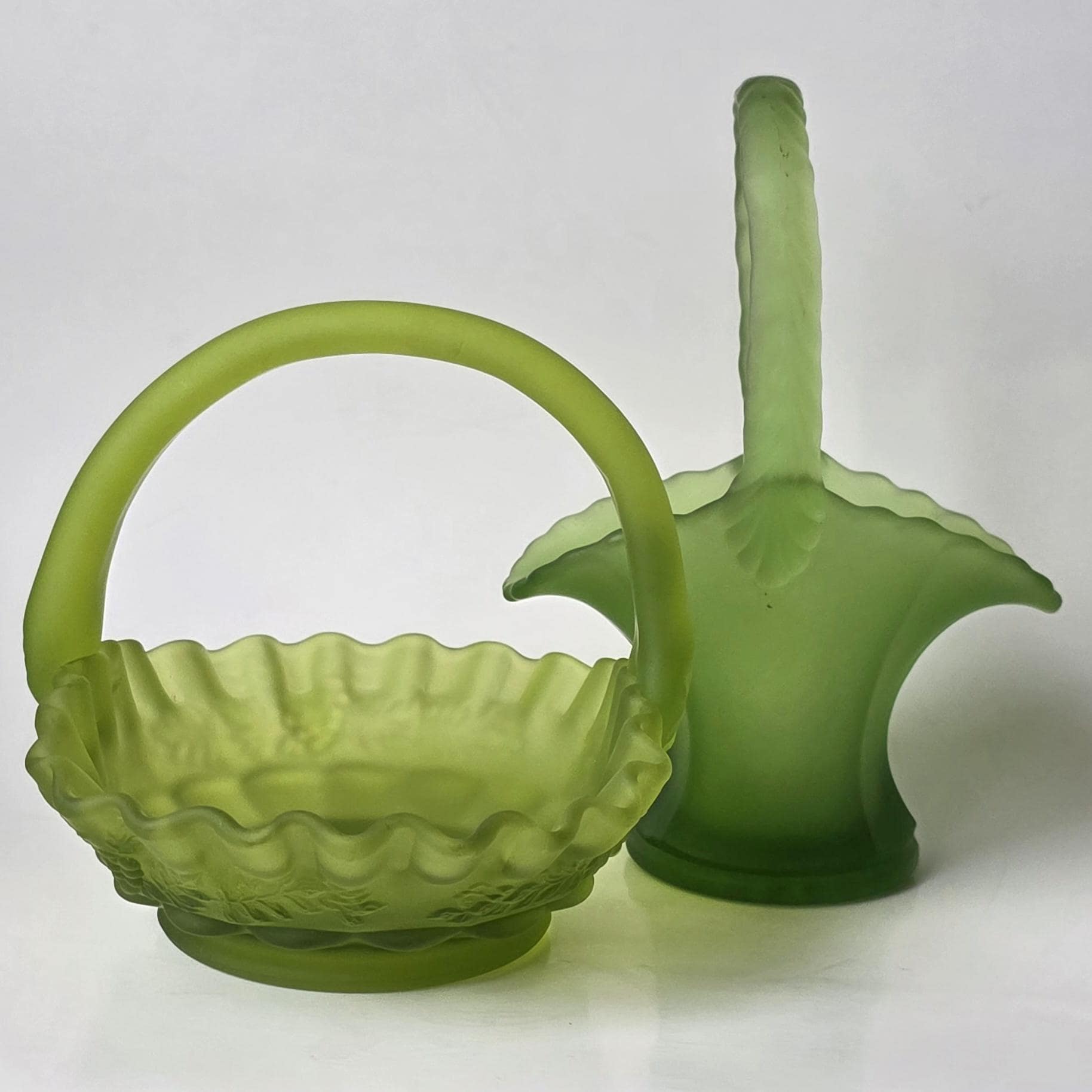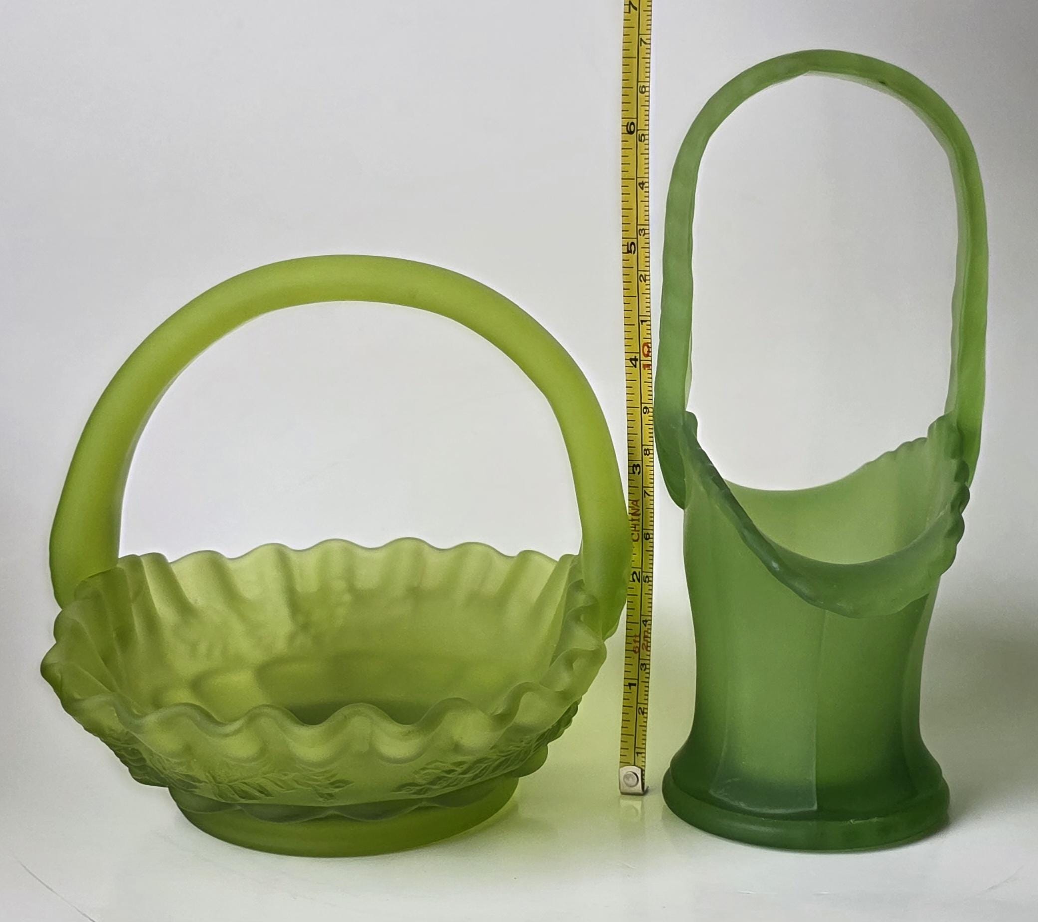 Lovely pair of frosted / satin green glass baskets by Westmoreland. Both have that classic smooth satin finish and display beautifully together.