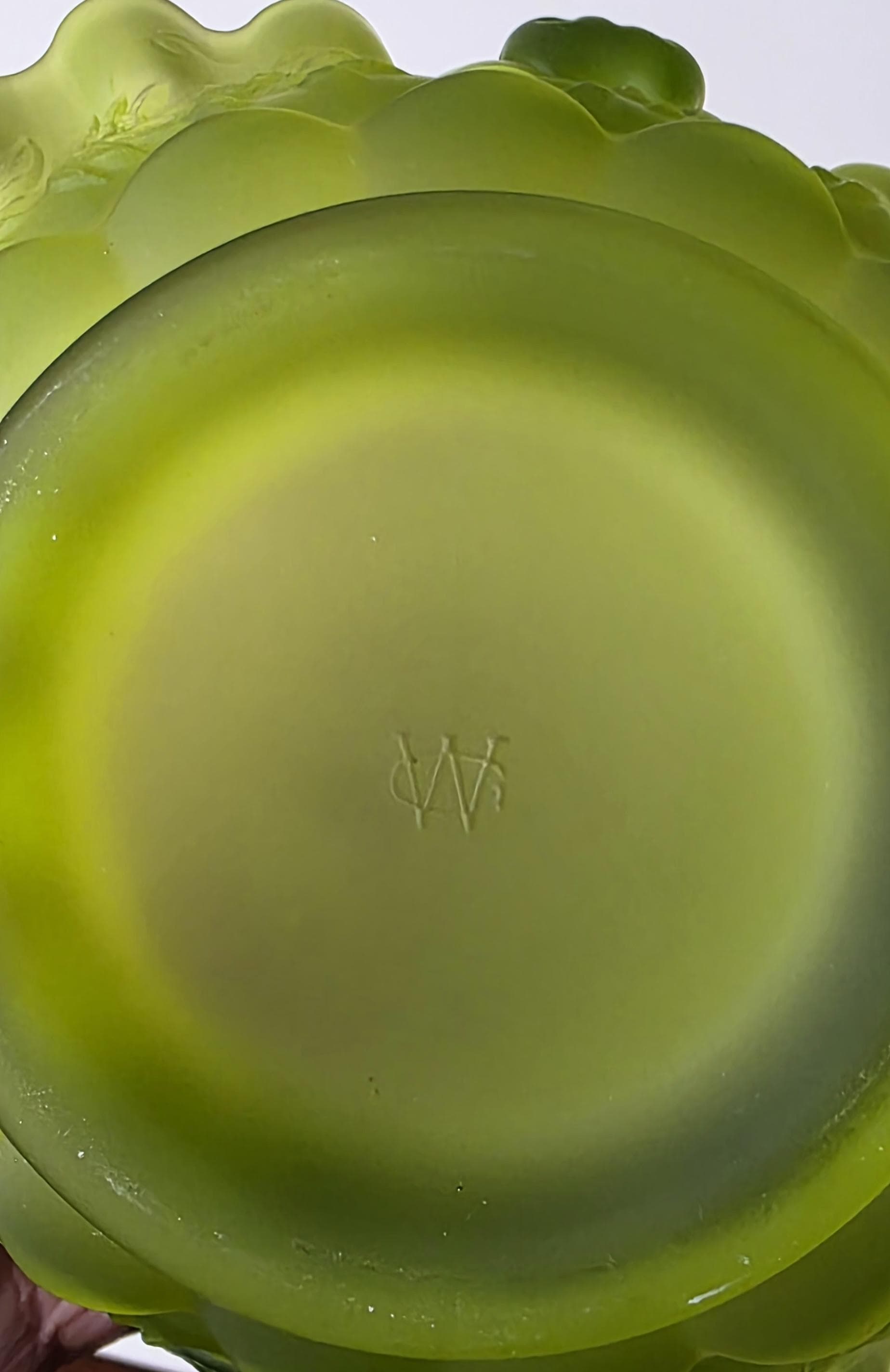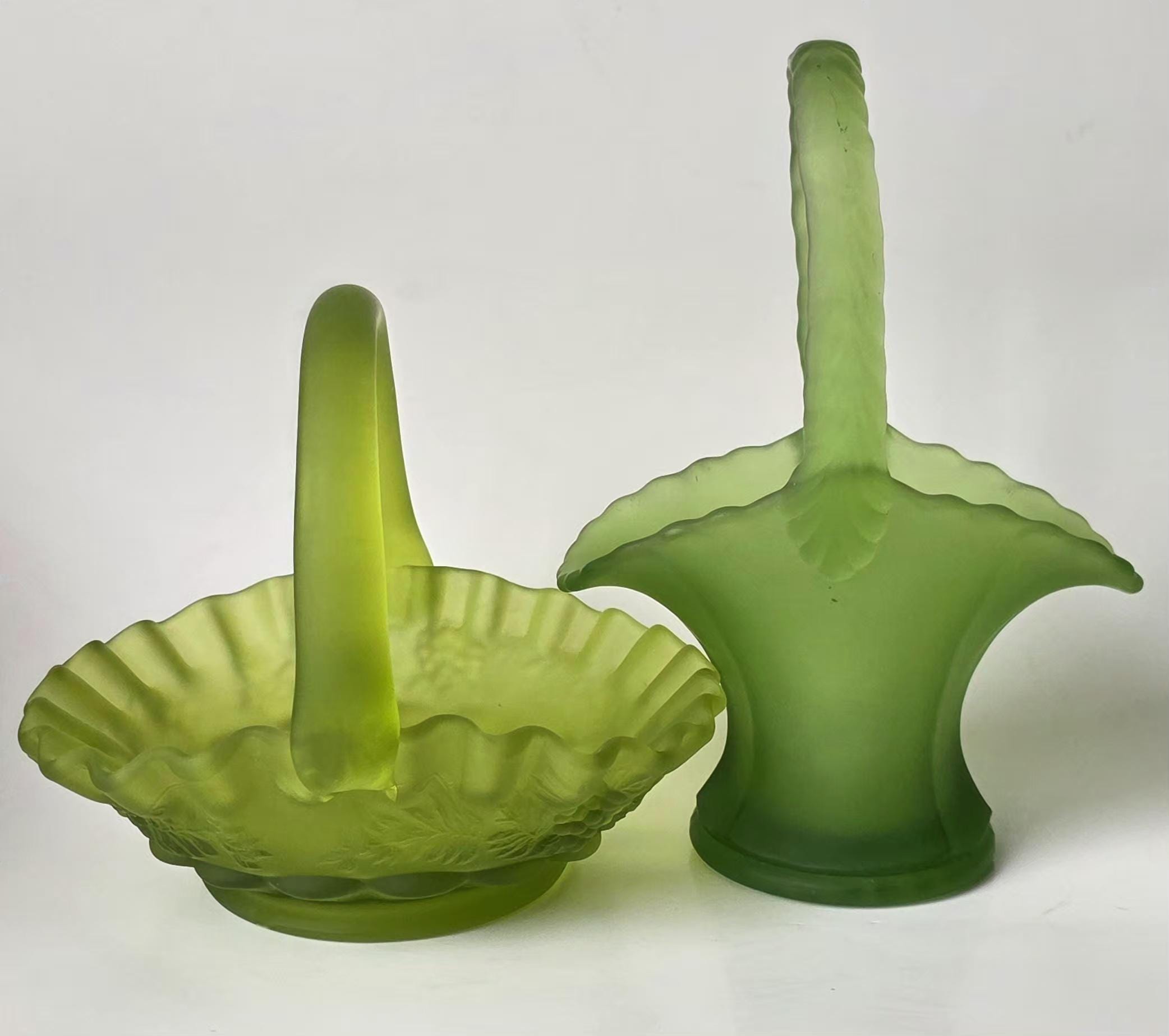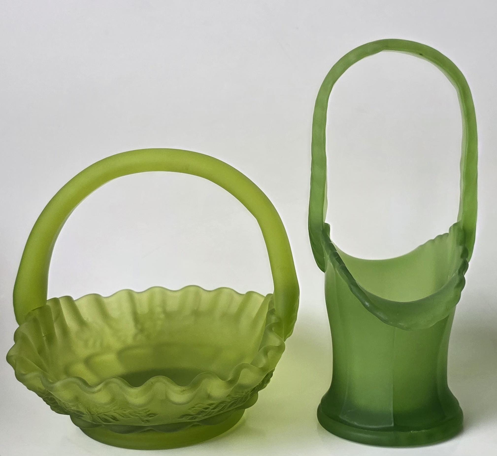 Lovely pair of frosted / satin green glass baskets by Westmoreland. Both have that classic smooth satin finish and display beautifully together.