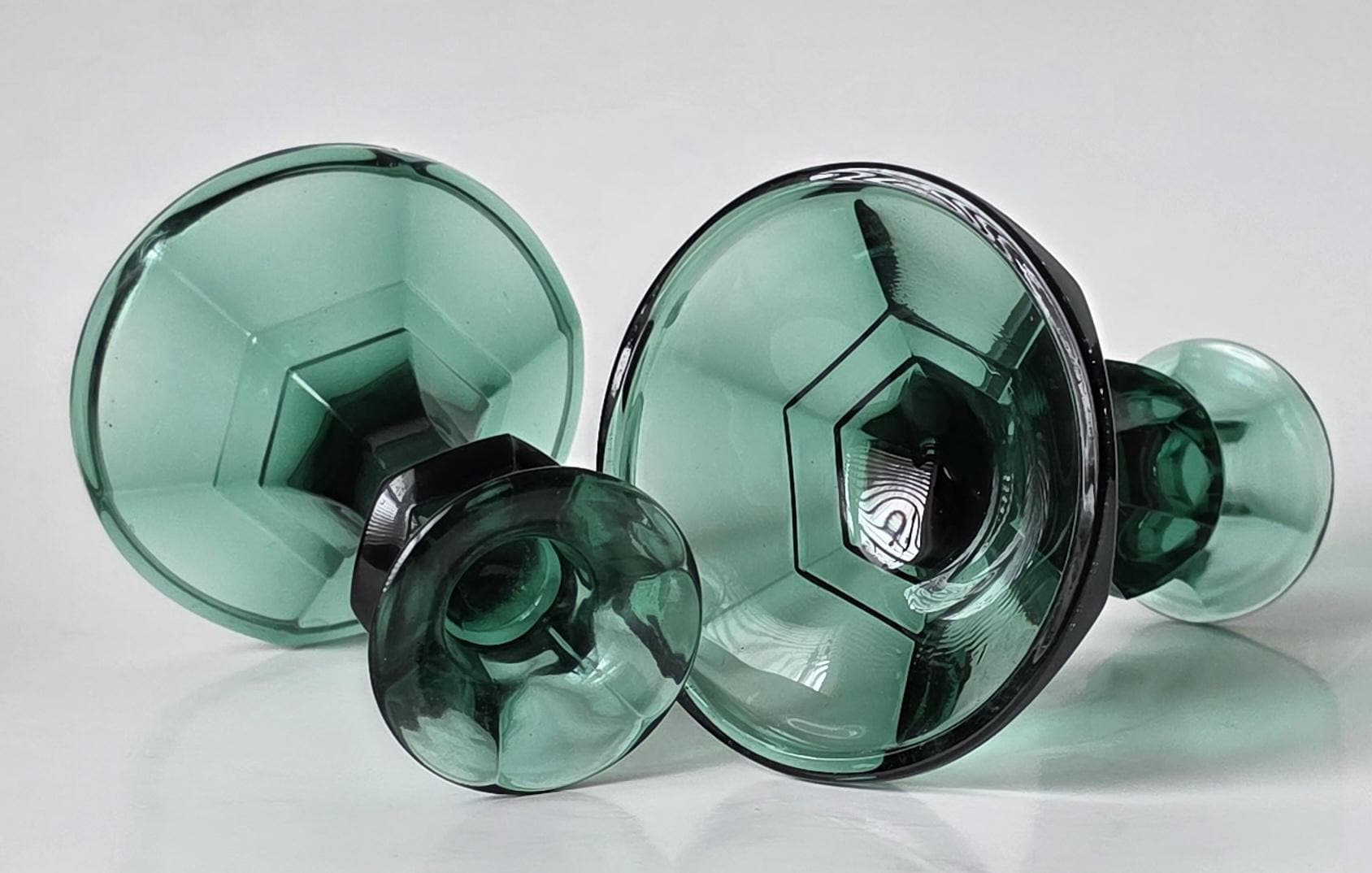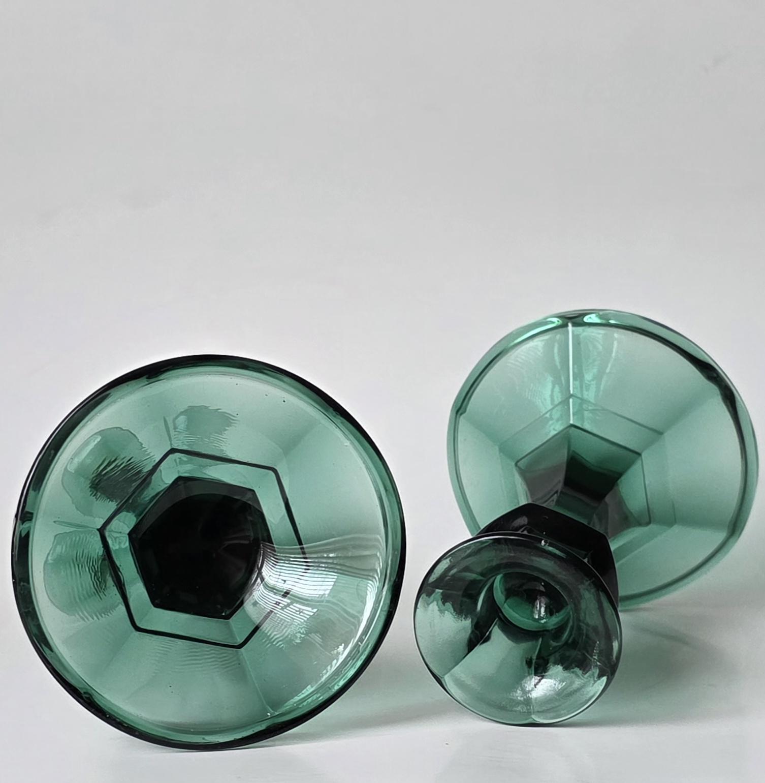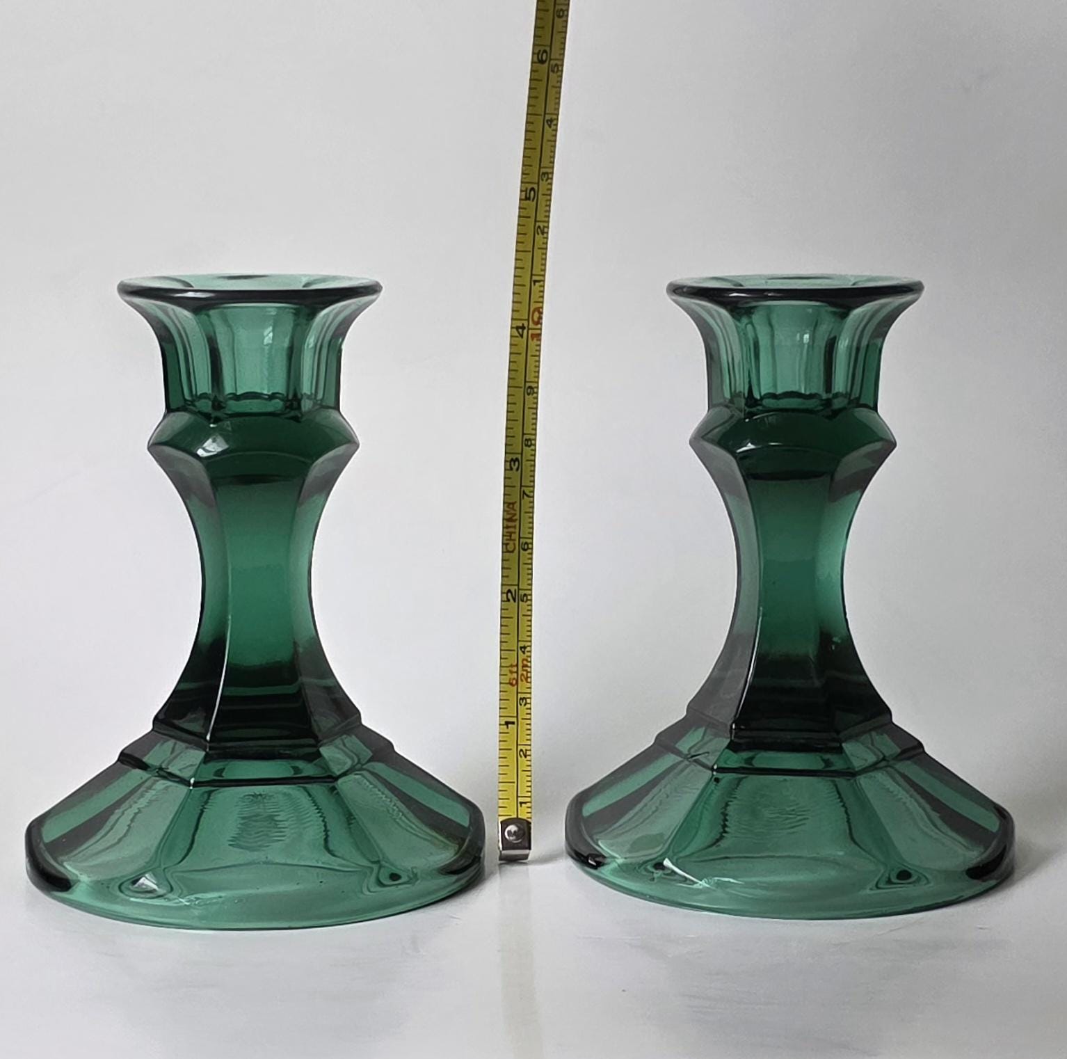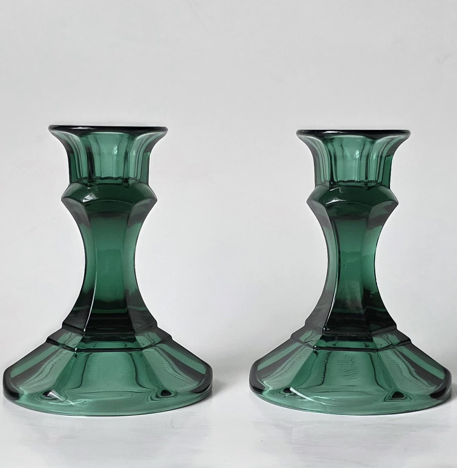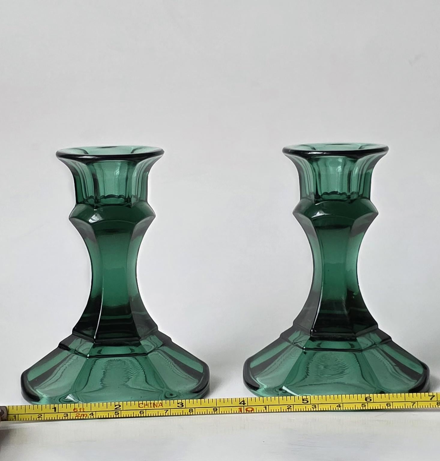 Vintage pair of Indiana Glass emerald green candle holders. Solid, heavy pressed glass with a faceted hexagonal base and flared top. Classic Mt. Vernon / Colony style.