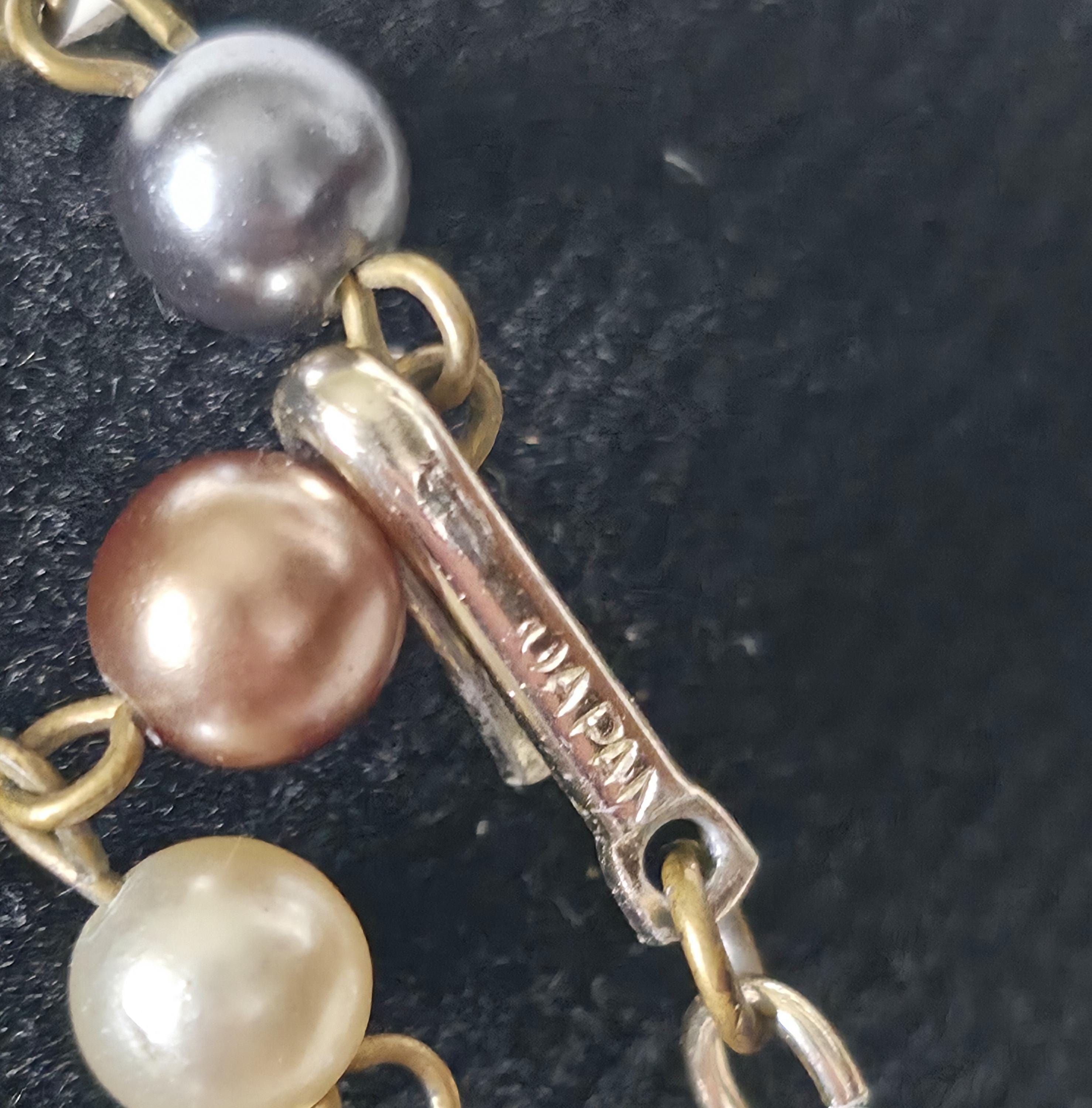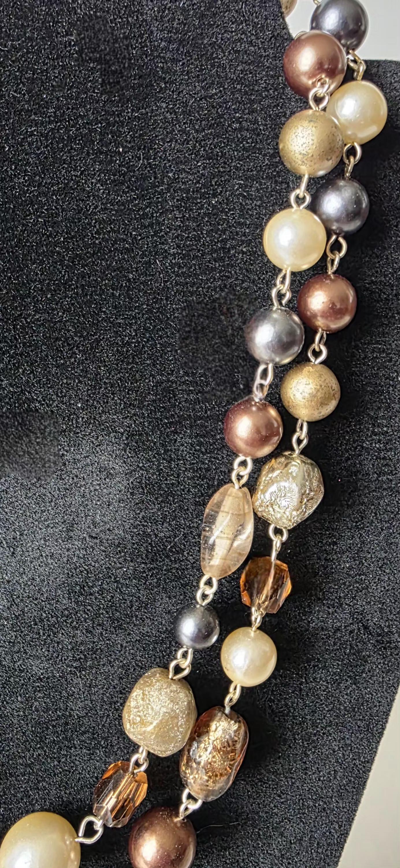 A lovely vintage 1950s double strand beaded necklace marked “JAPAN.” Features neutral faux pearls, lucite beads, faceted amber beads, and gold-tone textured beads in warm mixed metallic tones. Adjustable hook clasp (16–18 inches).