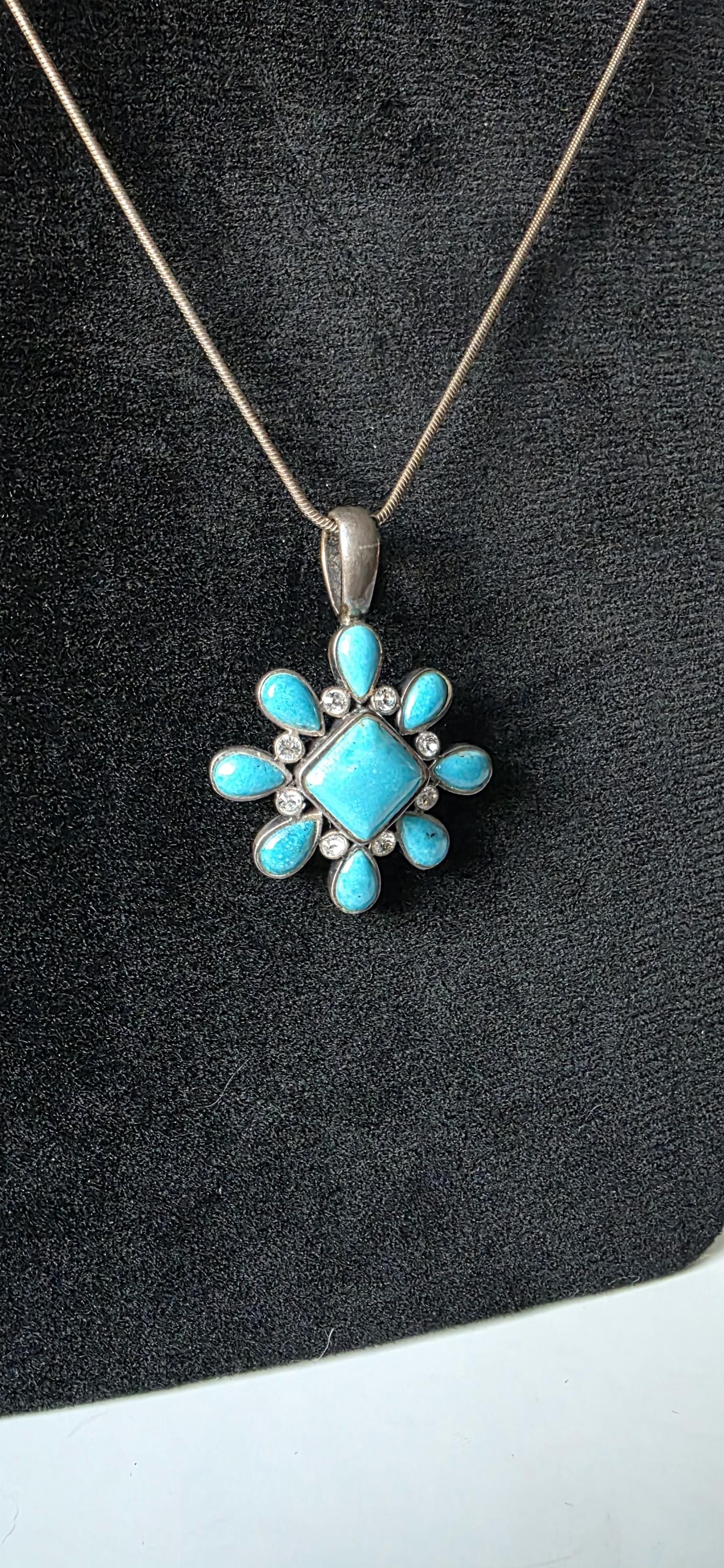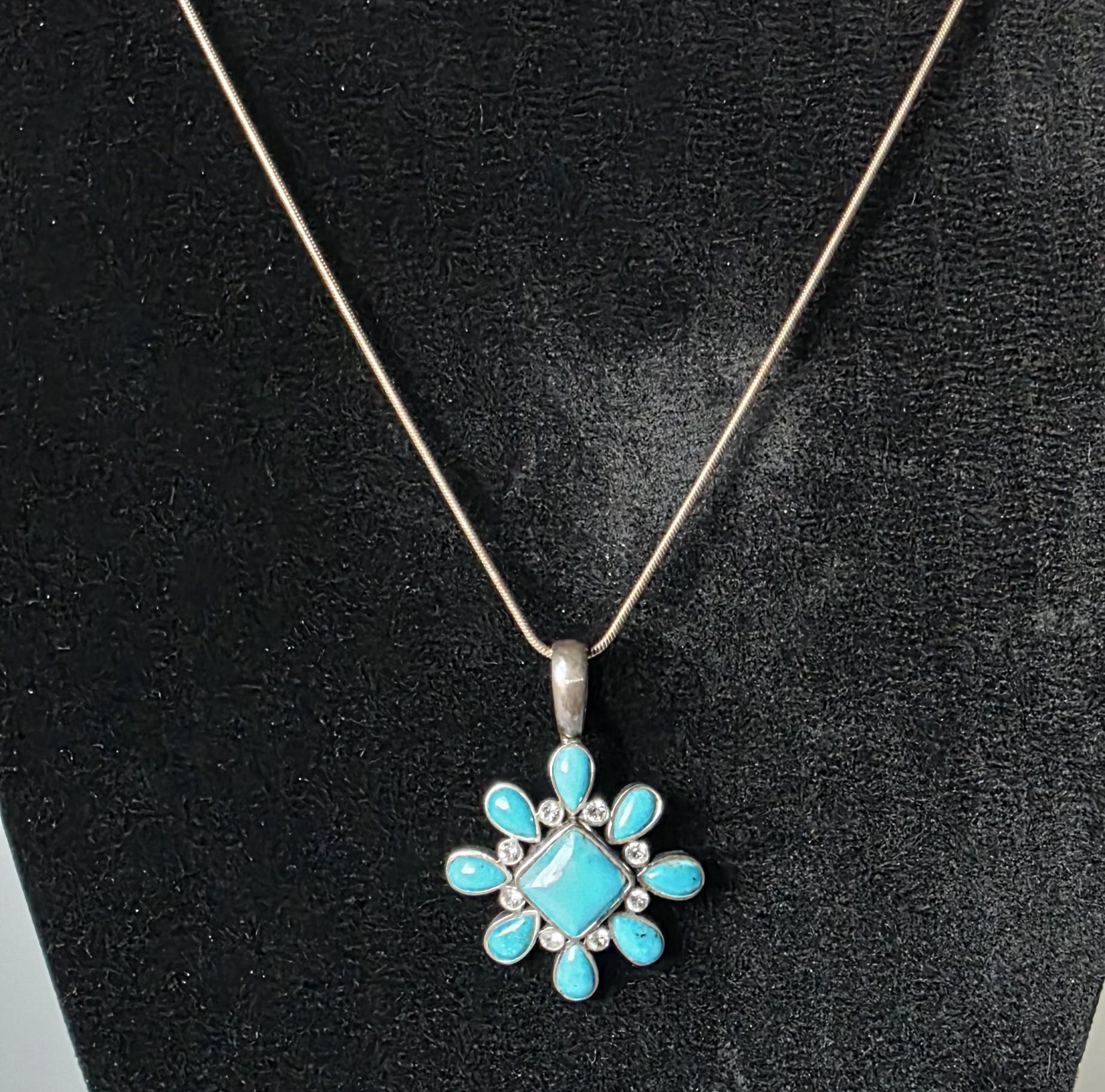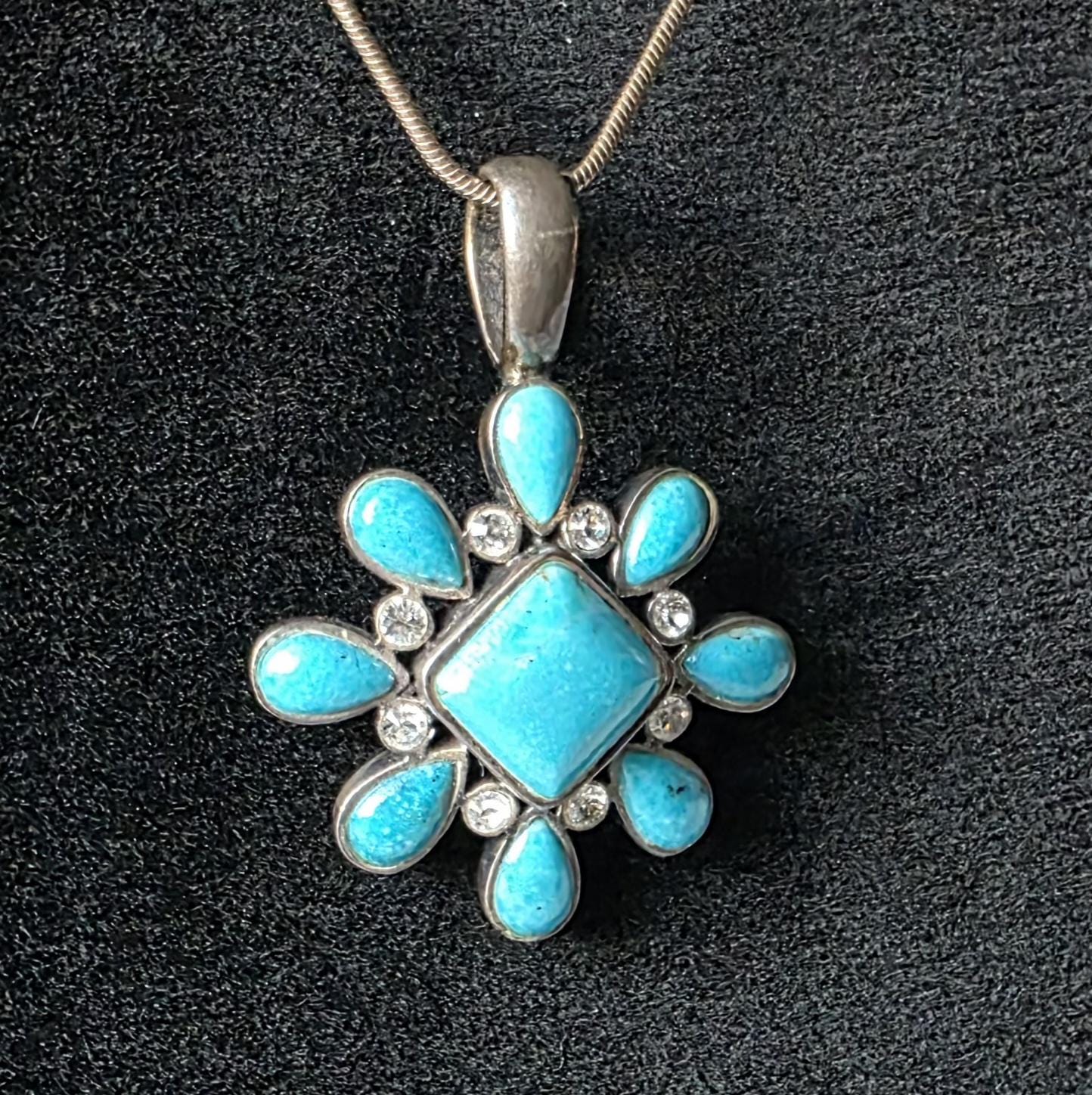 The bold, floral sunburst design uses meticulously cut turquoise stones and sparkling white accents, all set in a substantial .925 Sterling Silver base. This is a collector-grade statement piece that commands attention.