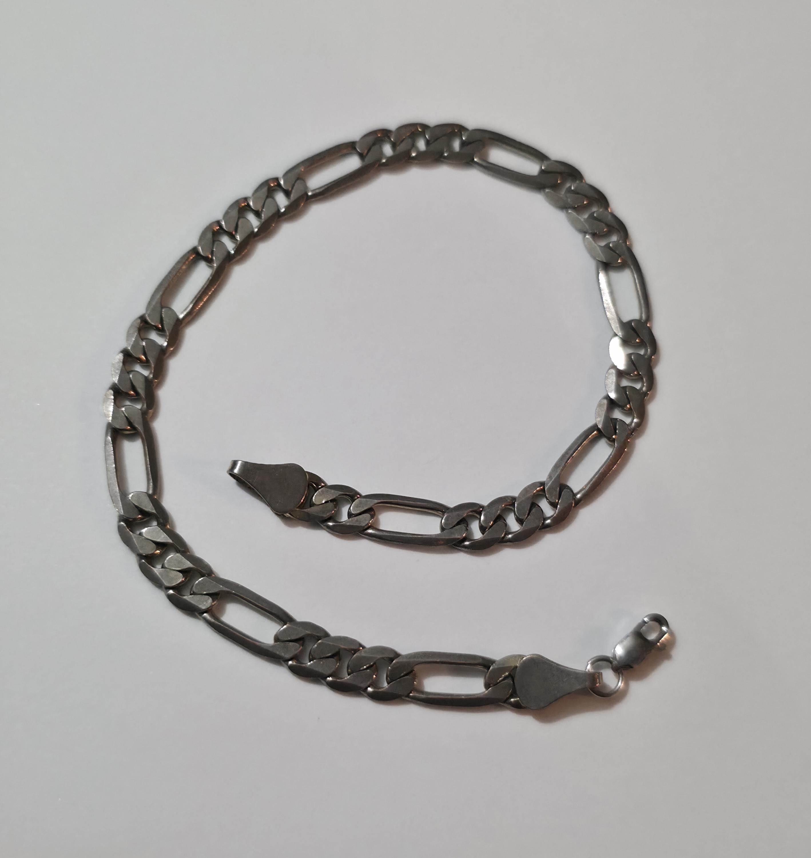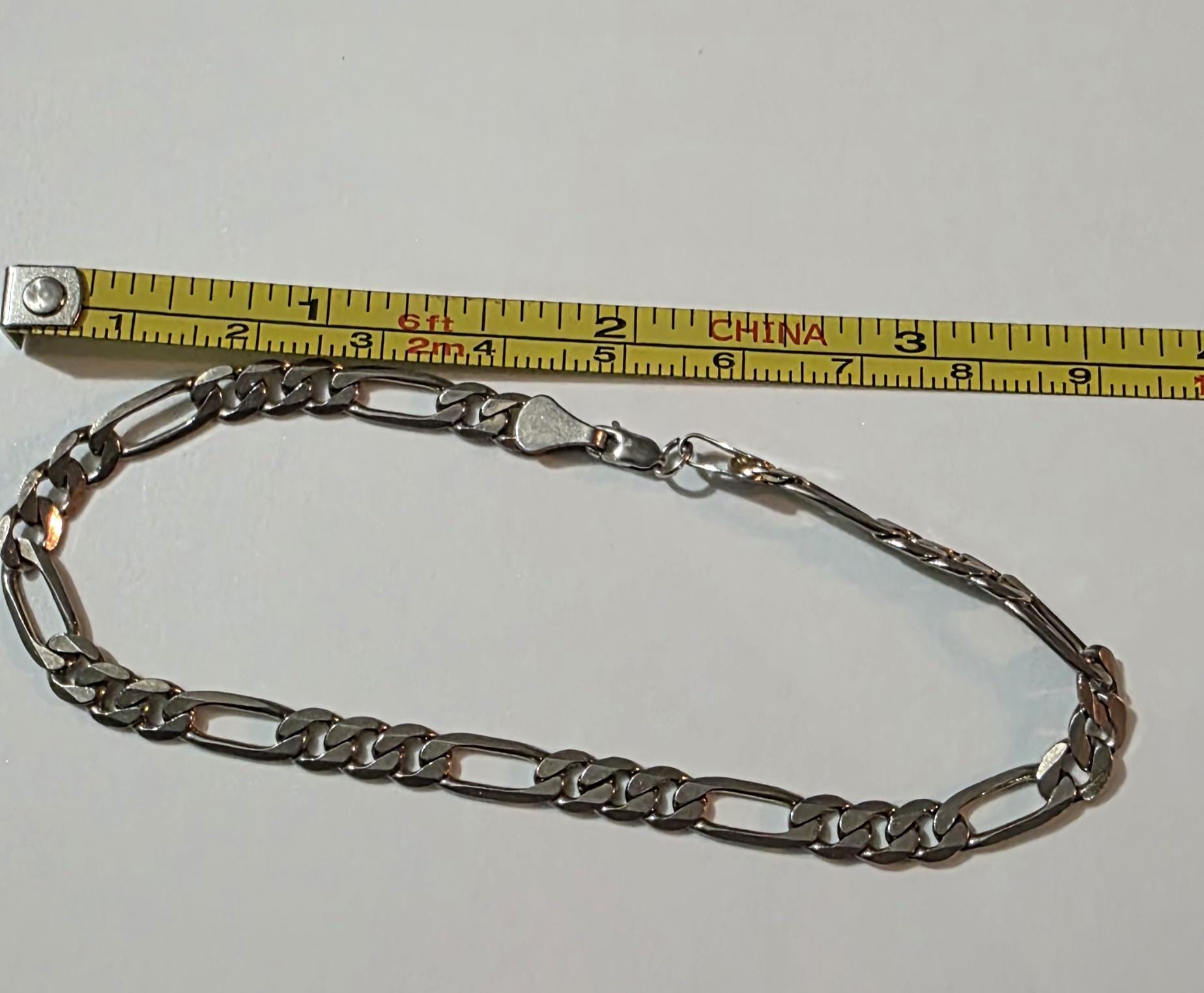 Classic Figaro chain bracelet in solid sterling silver. Features the traditional 3-to-1 link pattern with smooth, sturdy links that lay flat on the wrist. Finished with a strong lobster clasp for everyday wear.