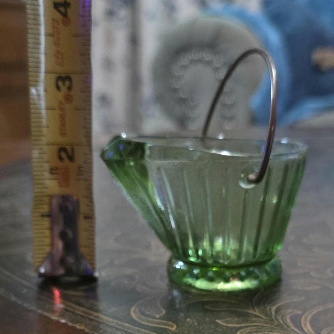 Delicate 115+ year old green pressed glass miniature basket with ribbed sides, a small pouring lip, and original metal swing handle. The glass reacts pink under UV light, consistent with manganese glass commonly used in early 20th-century pressed glass. The camera does not pick up the color change under UV at all, but to the naked eye the whole piece glows a beautiful pinkish purple color under 365 nm.